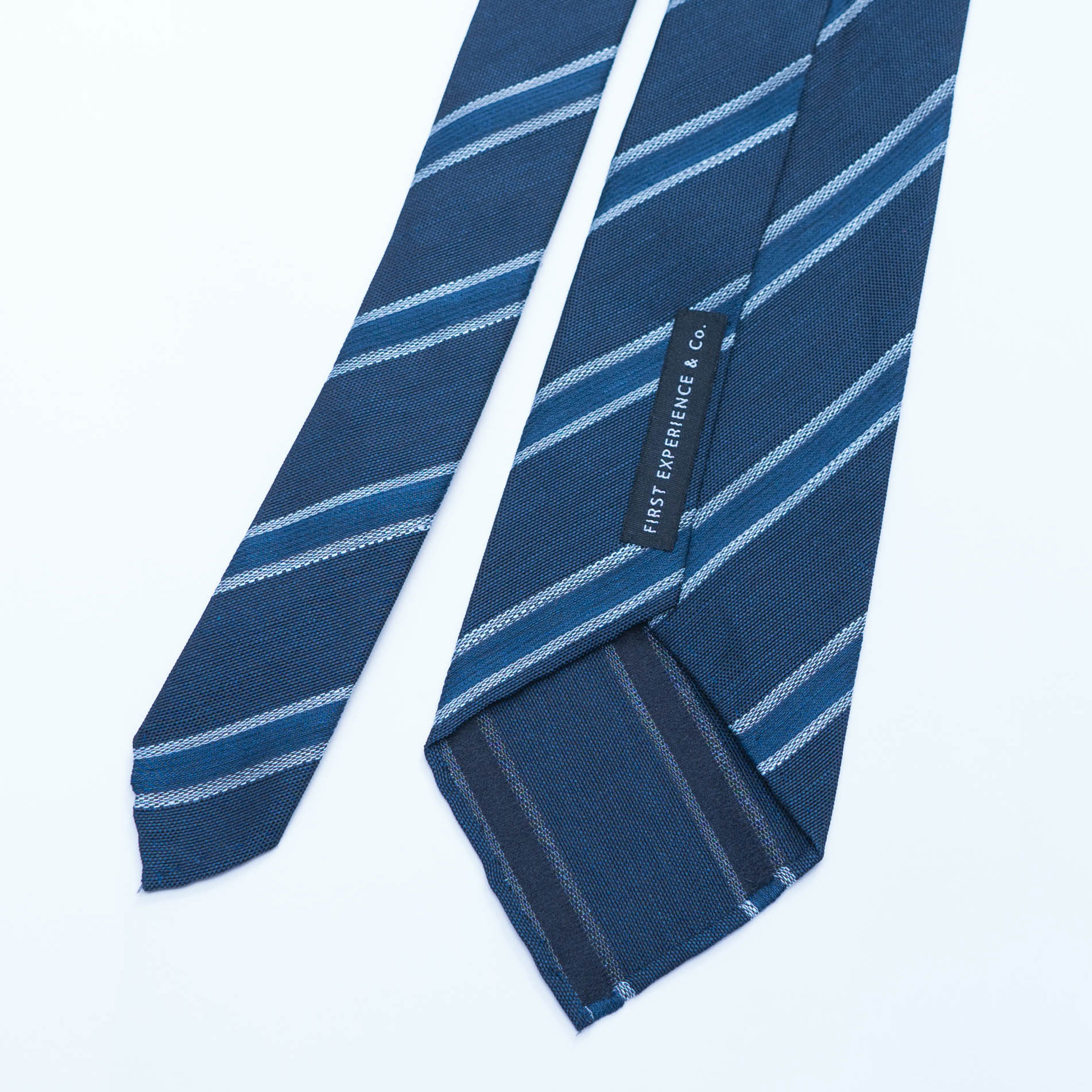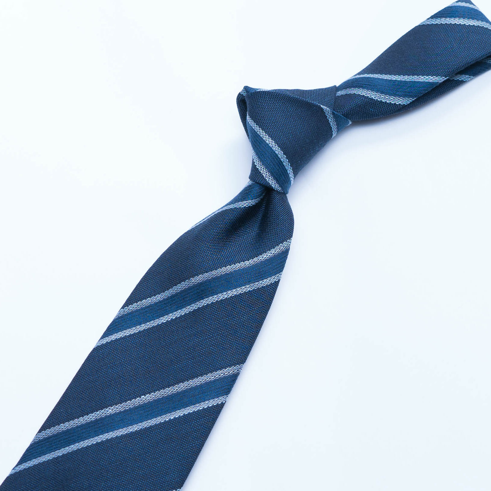 セッテピエゲという製法(イタリア語で7つ折り)を得意としている日本唯一ともいえる職人に、裏地を排しスカーフのような質感のネクタイをフルハンドでつくったネイビー・レジメンタルのタイです