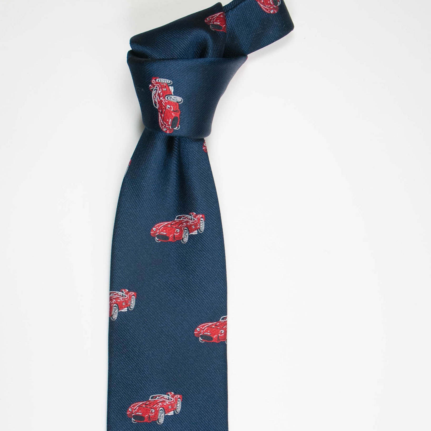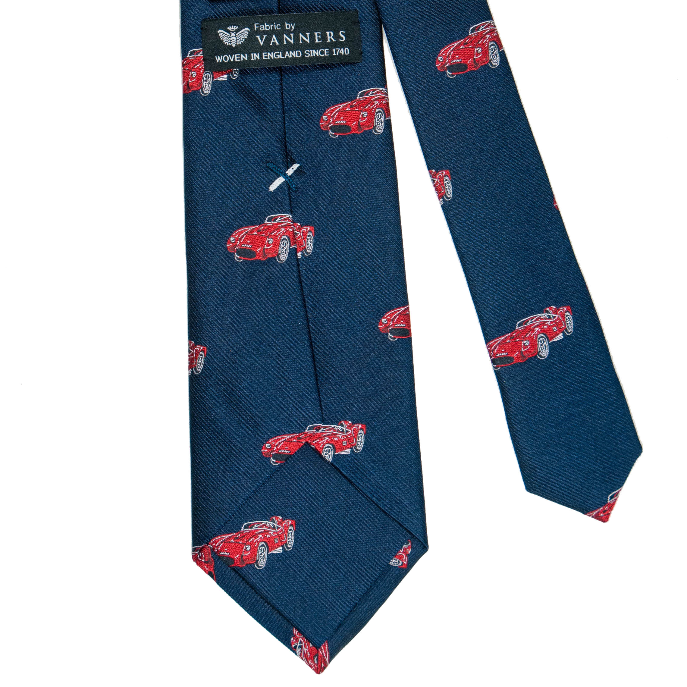 英国VANNERSの生地を使い京丹後の職人が1本1本手縫いで仕上げたきれいなネイビーに車柄のタイです。