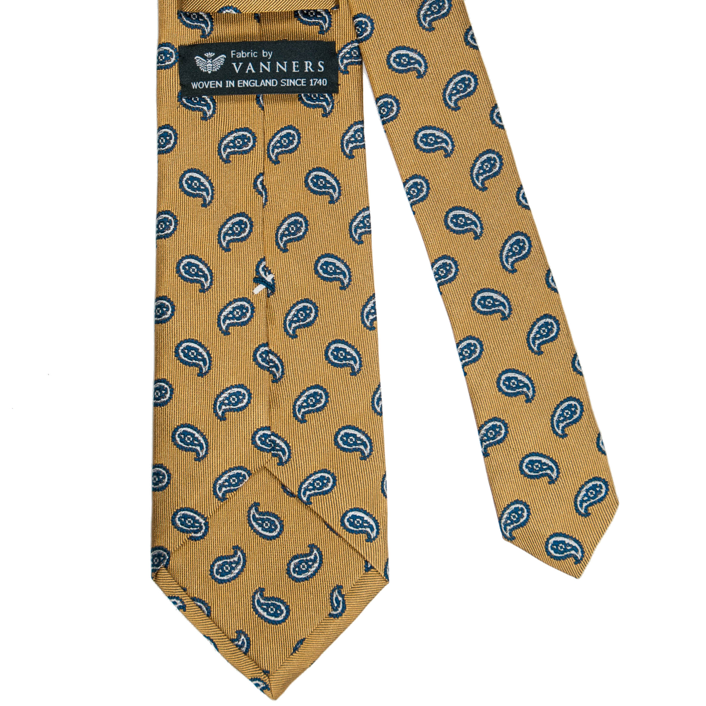 英国の老舗シルク織物ファクトリーが作った生地を京丹後の職人が1本1本手縫いで仕上げたきれいなゴールドイエローにペーズリー柄のタイです。