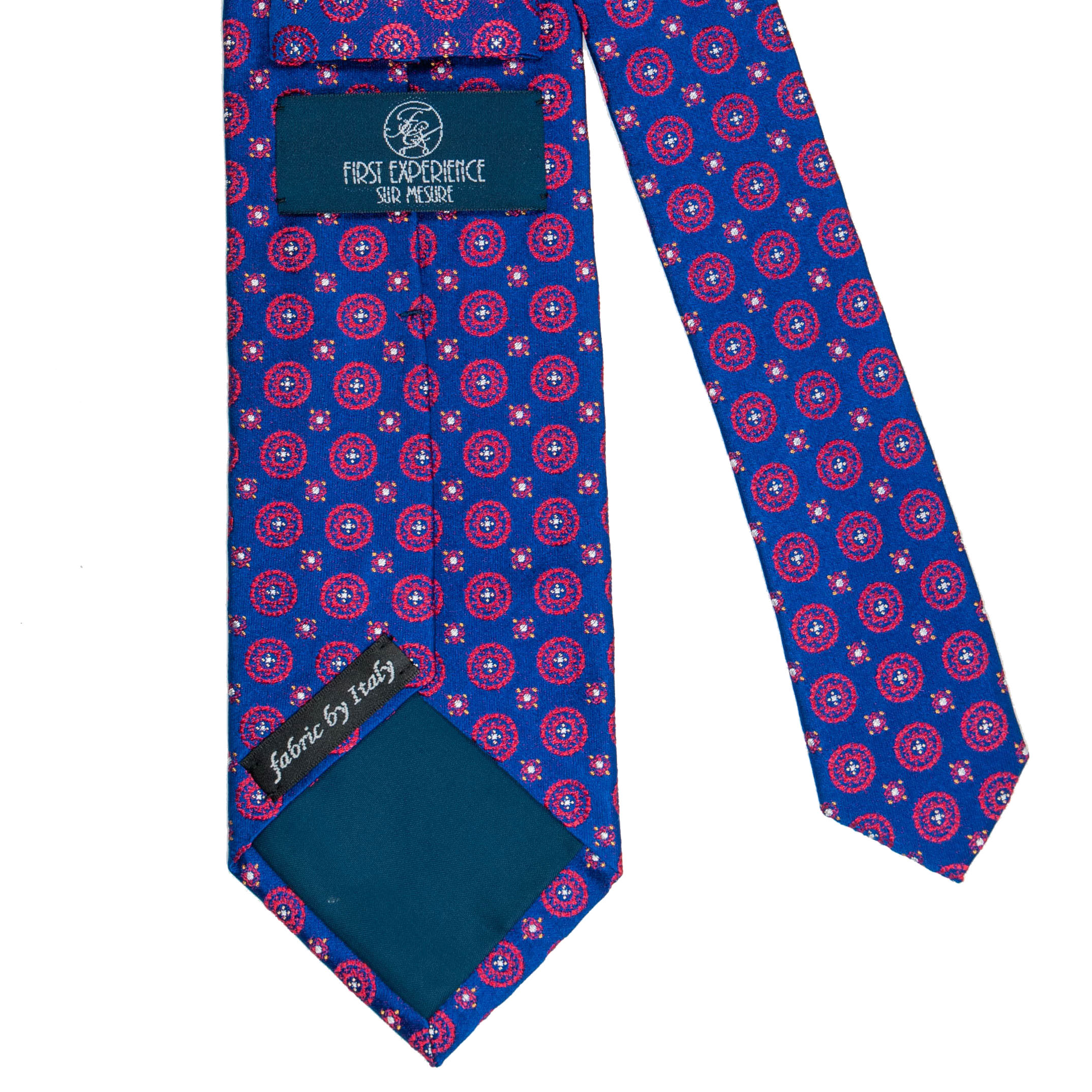 イタリア「カネパ社」のリネン100%のインポートファブリックを使用したネイビーに円形レッドのお洒落なタイです。