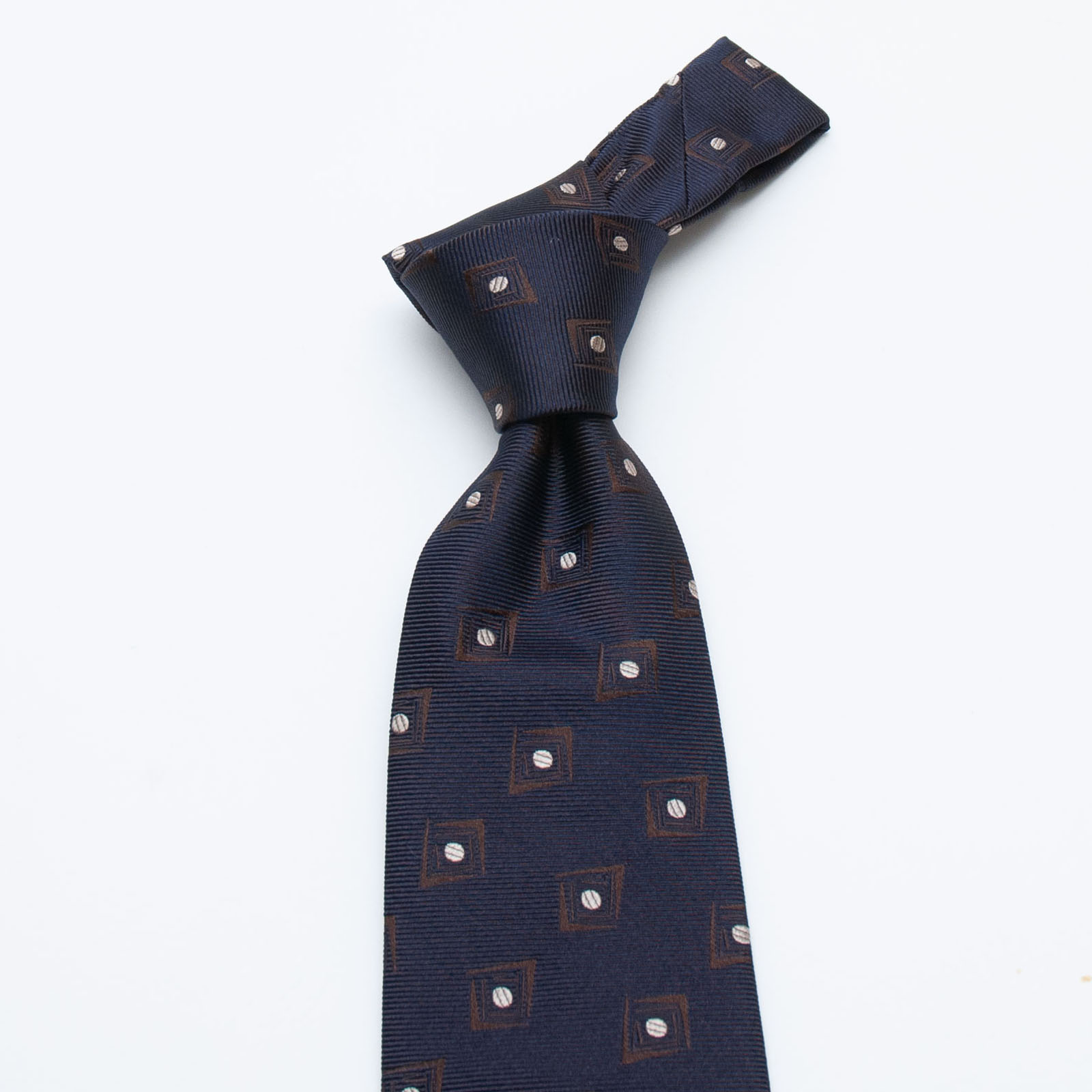 イタリアの素材を使い京丹後の新進気鋭の職人が1本1本手縫いで仕上げたきれいなネイビーにスクエア柄とドット柄のタイです。