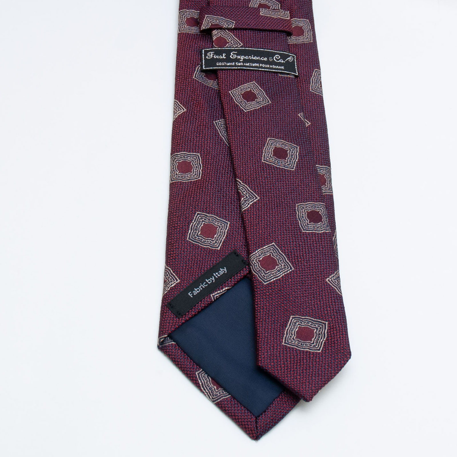 イタリアの素材を使い京丹後の新進気鋭の職人が1本1本手縫いで仕上げたきれいなレッドにアイボリー・スクエア柄のタイです。