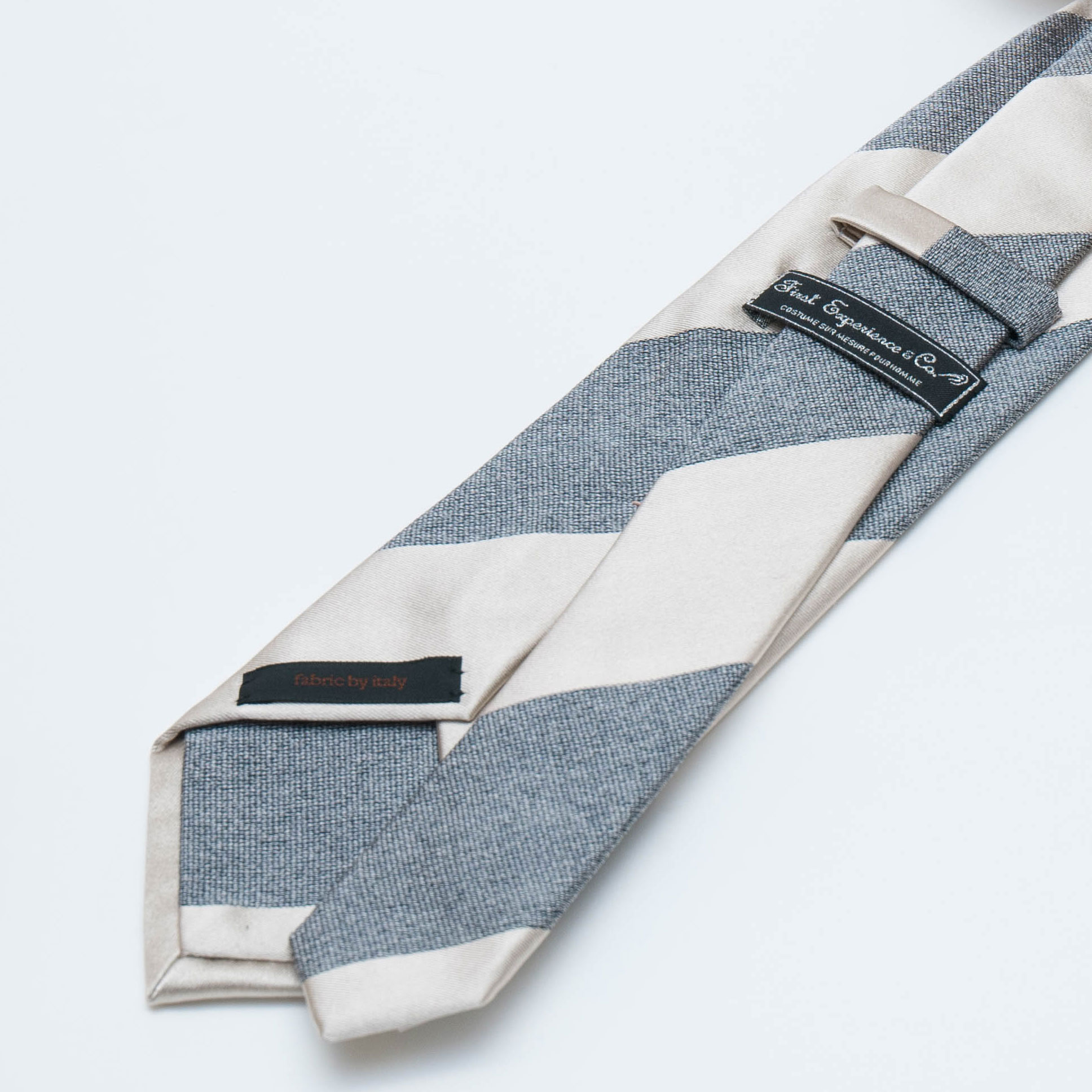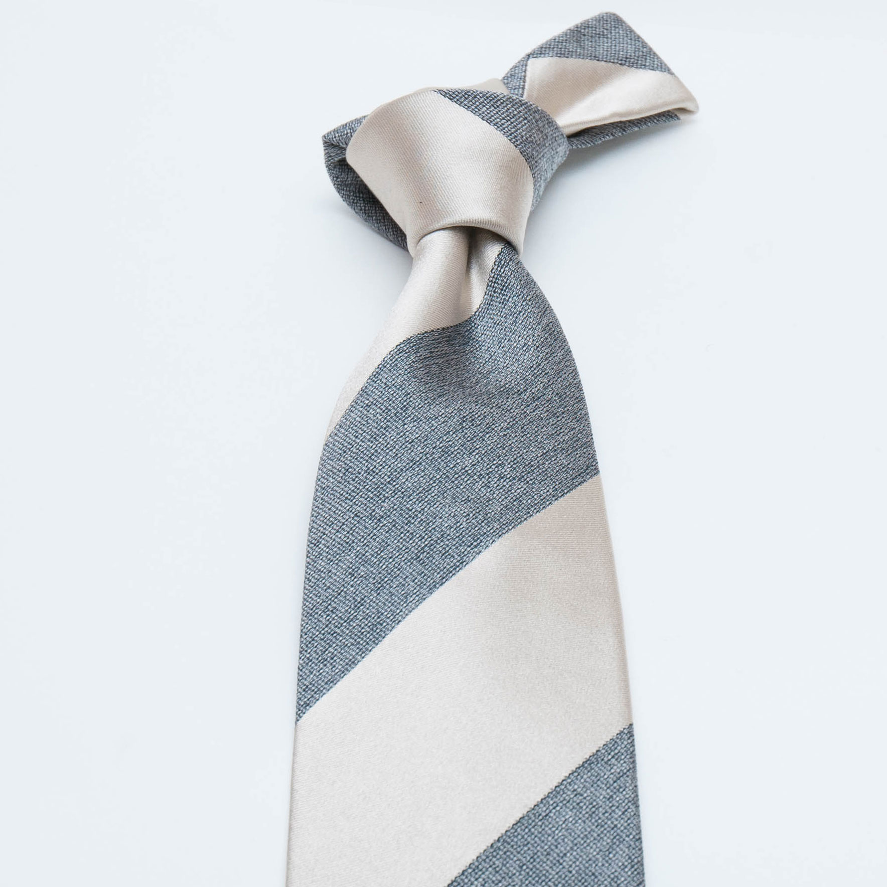 イタリアの素材を使い京丹後の新進気鋭の職人が1本1本手縫いで仕上げた光沢感のあるシルバーサテン×ネイビーのレジメンタル柄のタイです。