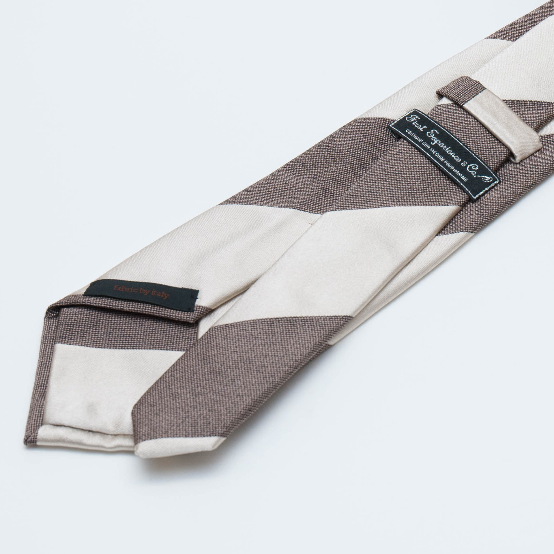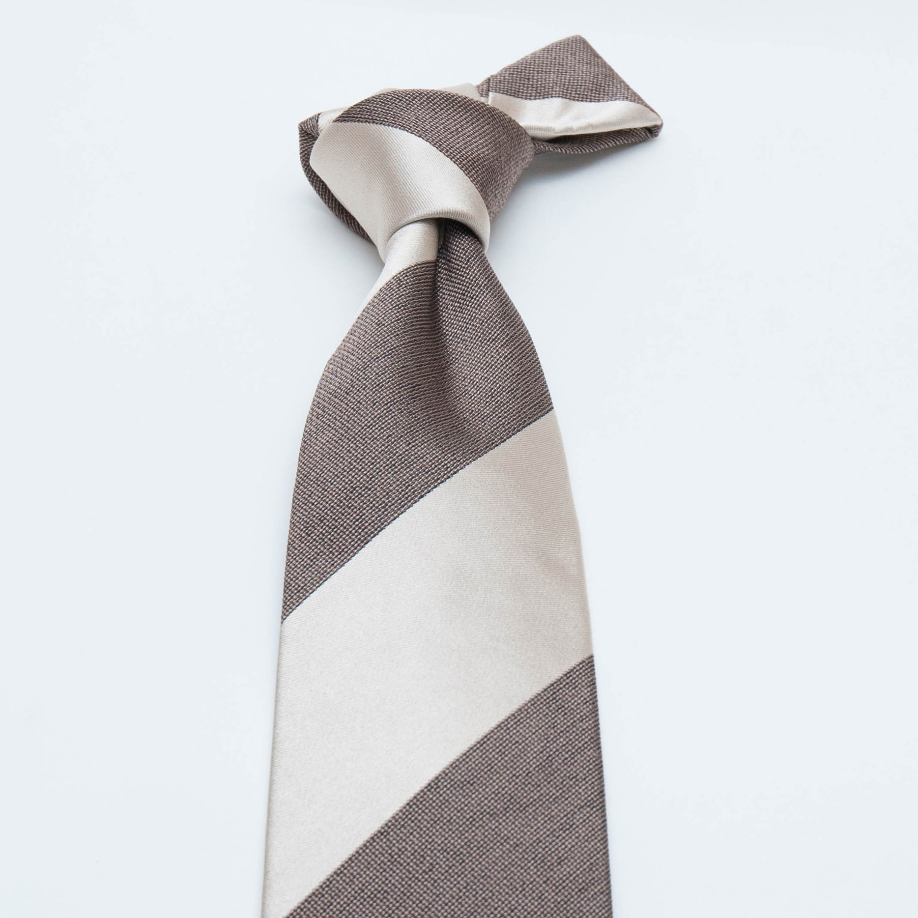 イタリアの素材を使い京丹後の新進気鋭の職人が1本1本手縫いで仕上げた光沢感のあるシルバーサテン×ブラウンのレジメンタル柄のタイです。