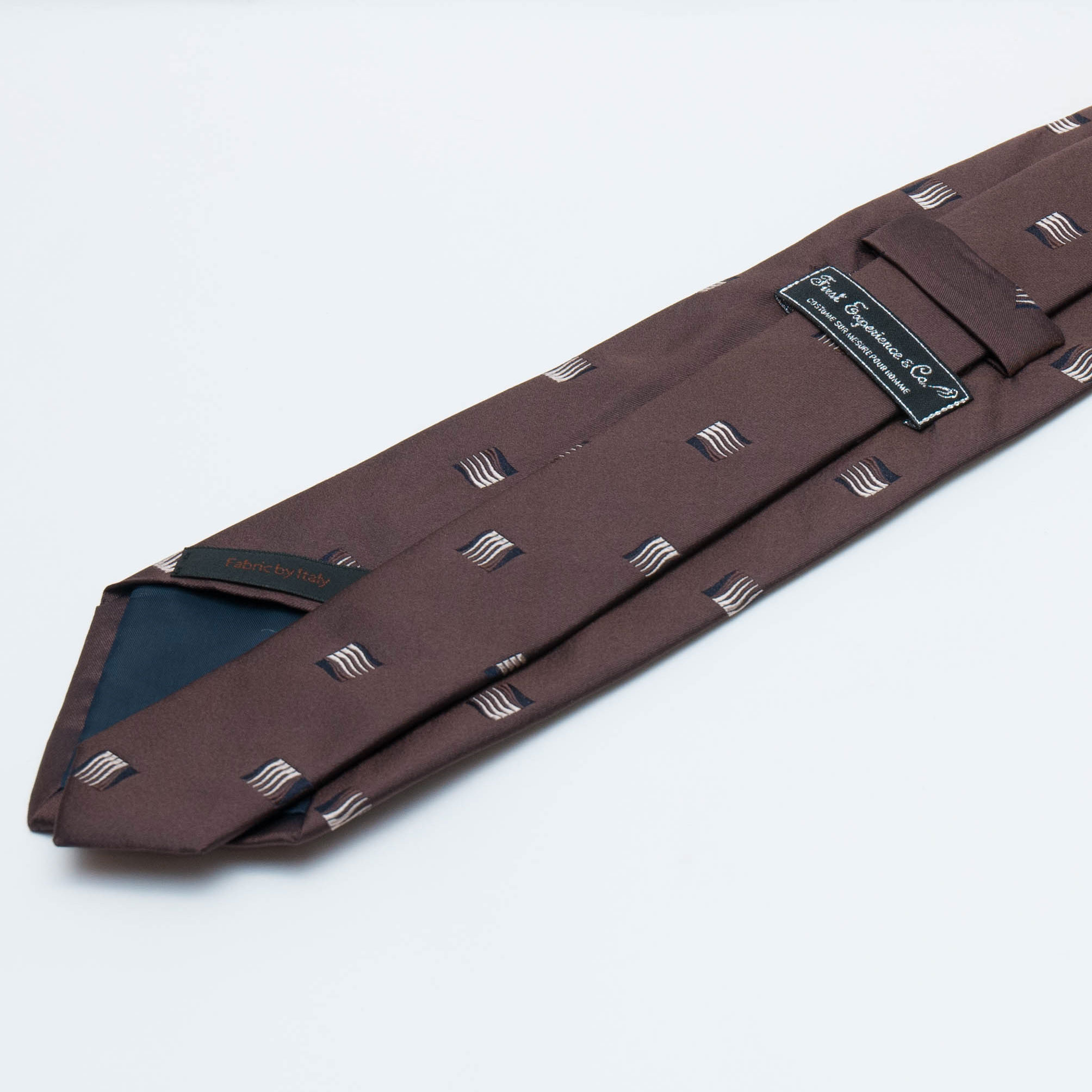 イタリアの素材を使い京丹後の新進気鋭の職人が1本1本手縫いで仕上げた光沢感のあるブラウンに波目模様の柄のタイです。