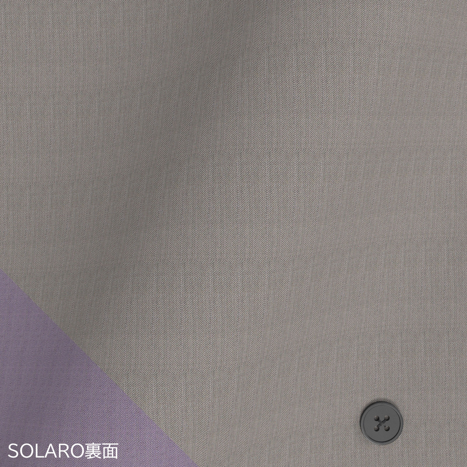 イタリアの夏の定番生地で、イタリア語で太陽を意味するライトグレー×裏パープルのストレッチが効いたヘリンボーン織の玉虫色に輝くソラーロ生地です。