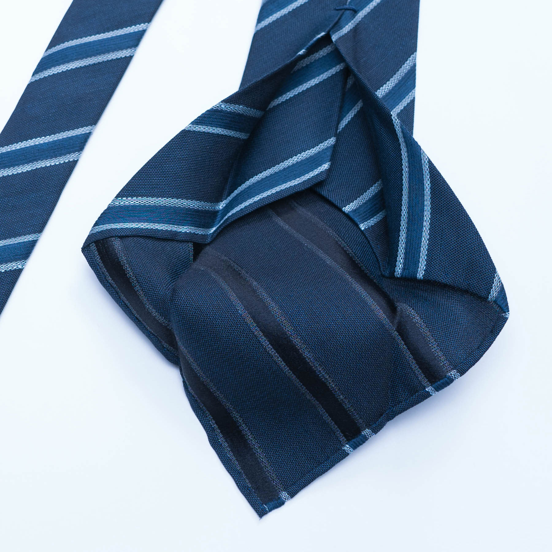 セッテピエゲという製法(イタリア語で7つ折り)を得意としている日本唯一ともいえる職人に、裏地を排しスカーフのような質感のネクタイをフルハンドでつくったネイビー・レジメンタルのタイです