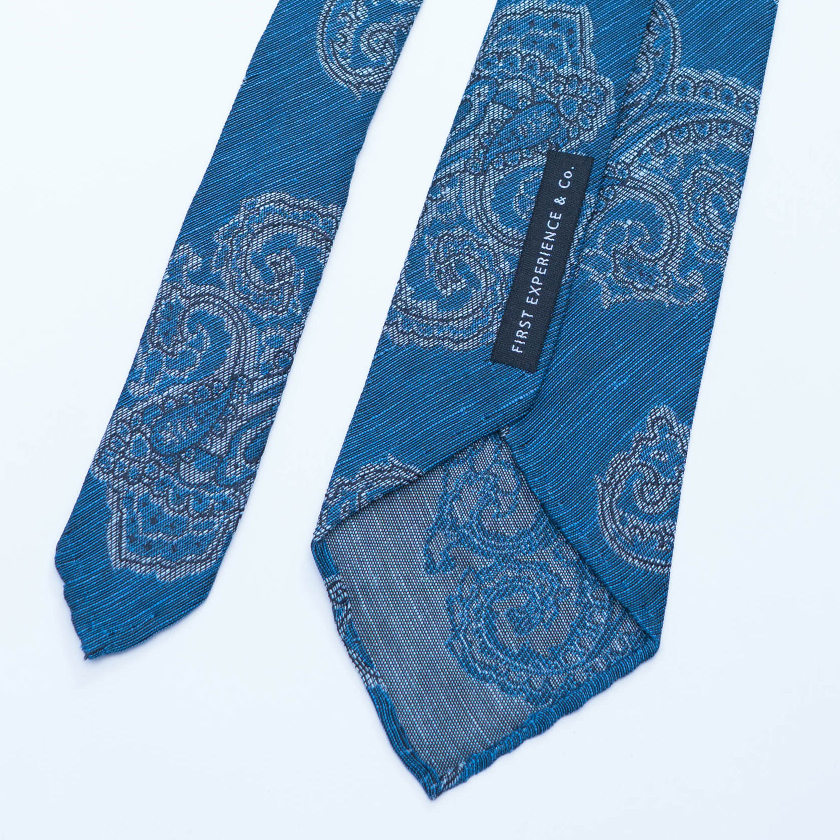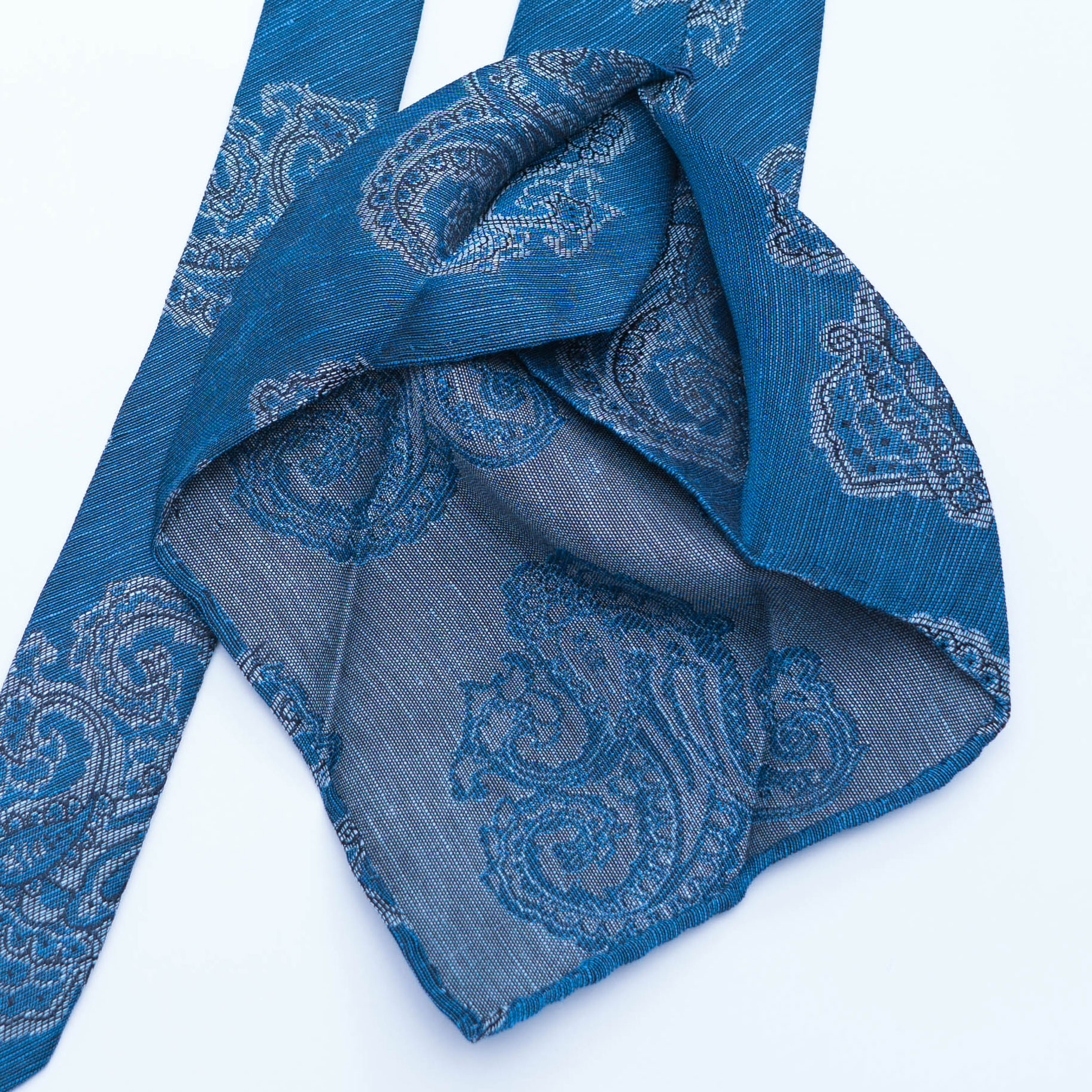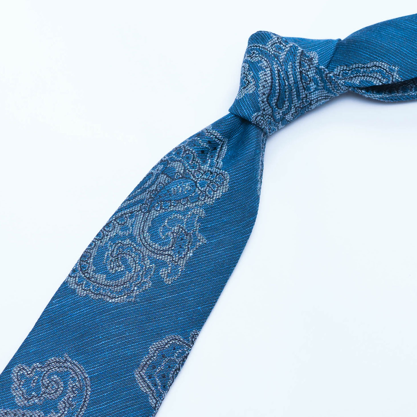 セッテピエゲという製法(イタリア語で7つ折り)を得意としている日本唯一ともいえる職人に、裏地を排しスカーフのような質感のネクタイをフルハンドでつくったブルー・ペイズリーのタイです
