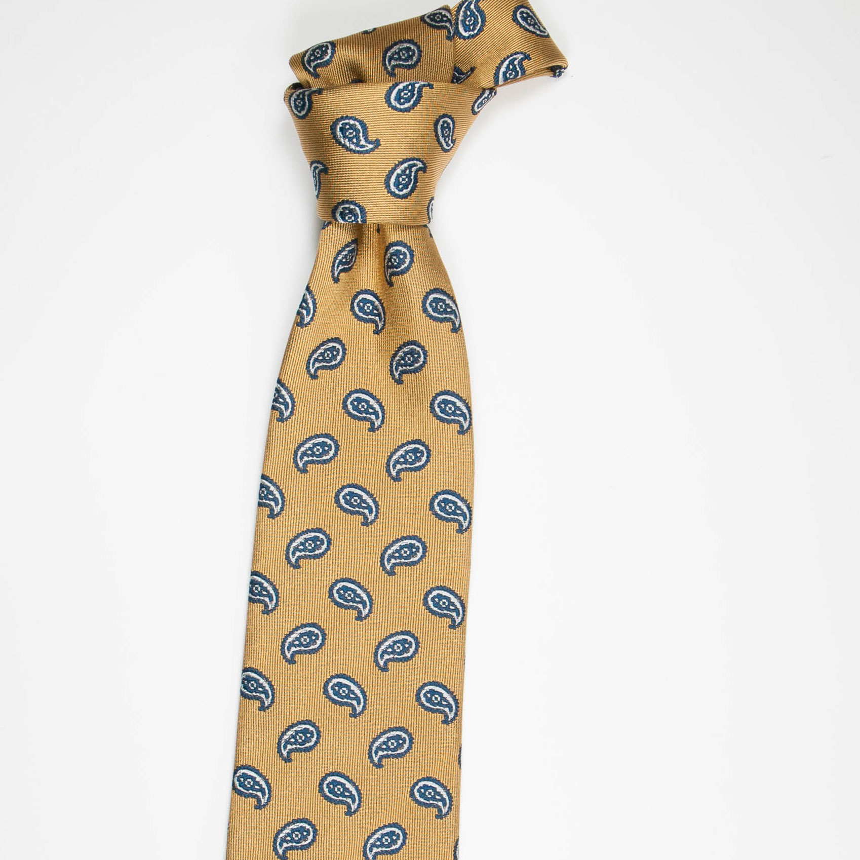 英国の老舗シルク織物ファクトリーが作った生地を京丹後の職人が1本1本手縫いで仕上げたきれいなゴールドイエローにペーズリー柄のタイです。