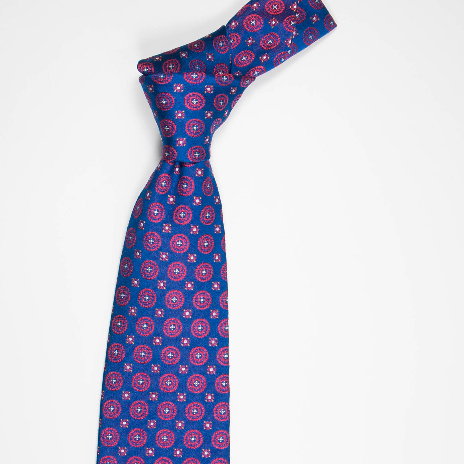 イタリア「カネパ社」のリネン100%のインポートファブリックを使用したネイビーに円形レッドのお洒落なタイです。