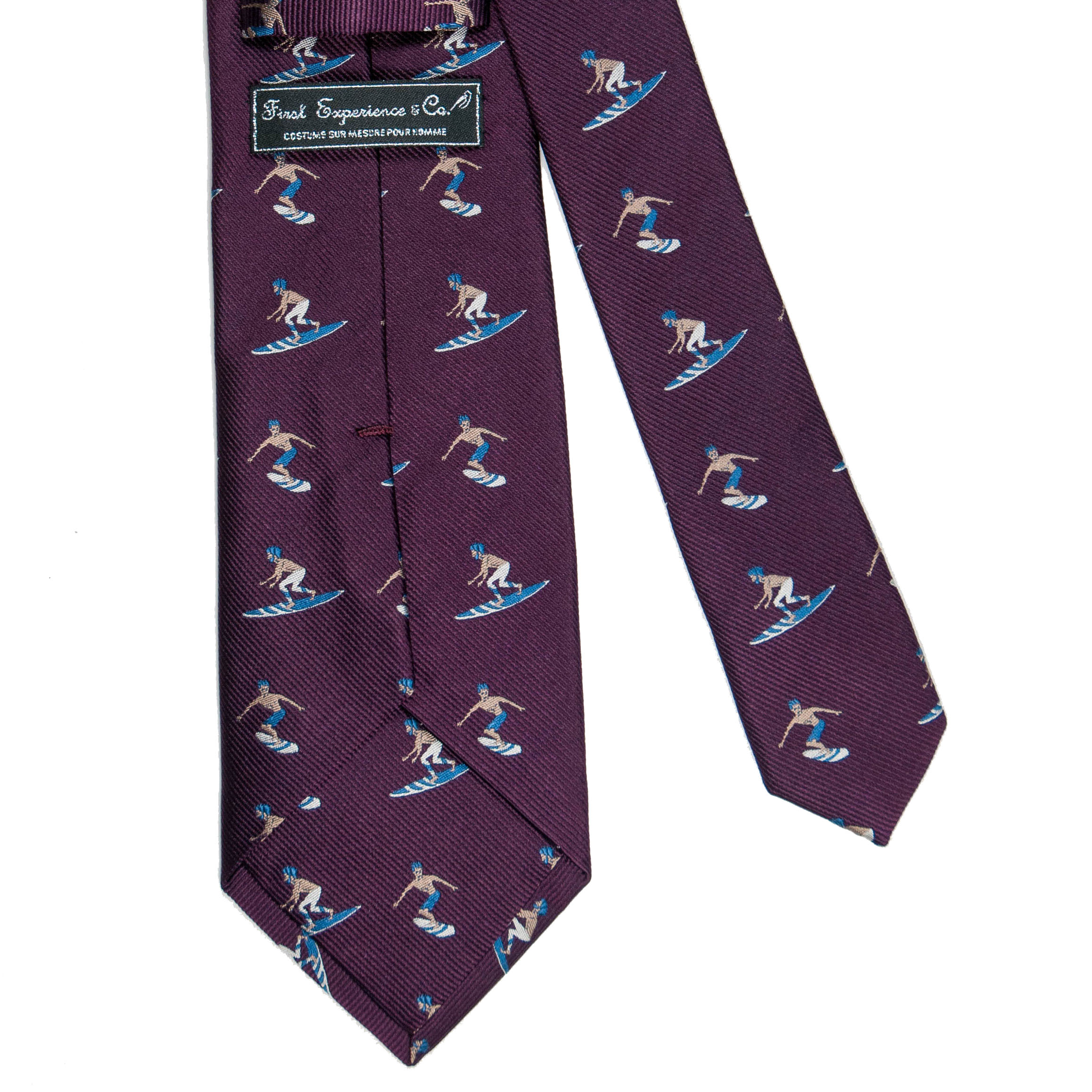 京都の素材を使い京丹後の職人が1本1本手縫いで仕上げたきれいなバーガンディにサーファー柄のタイです。