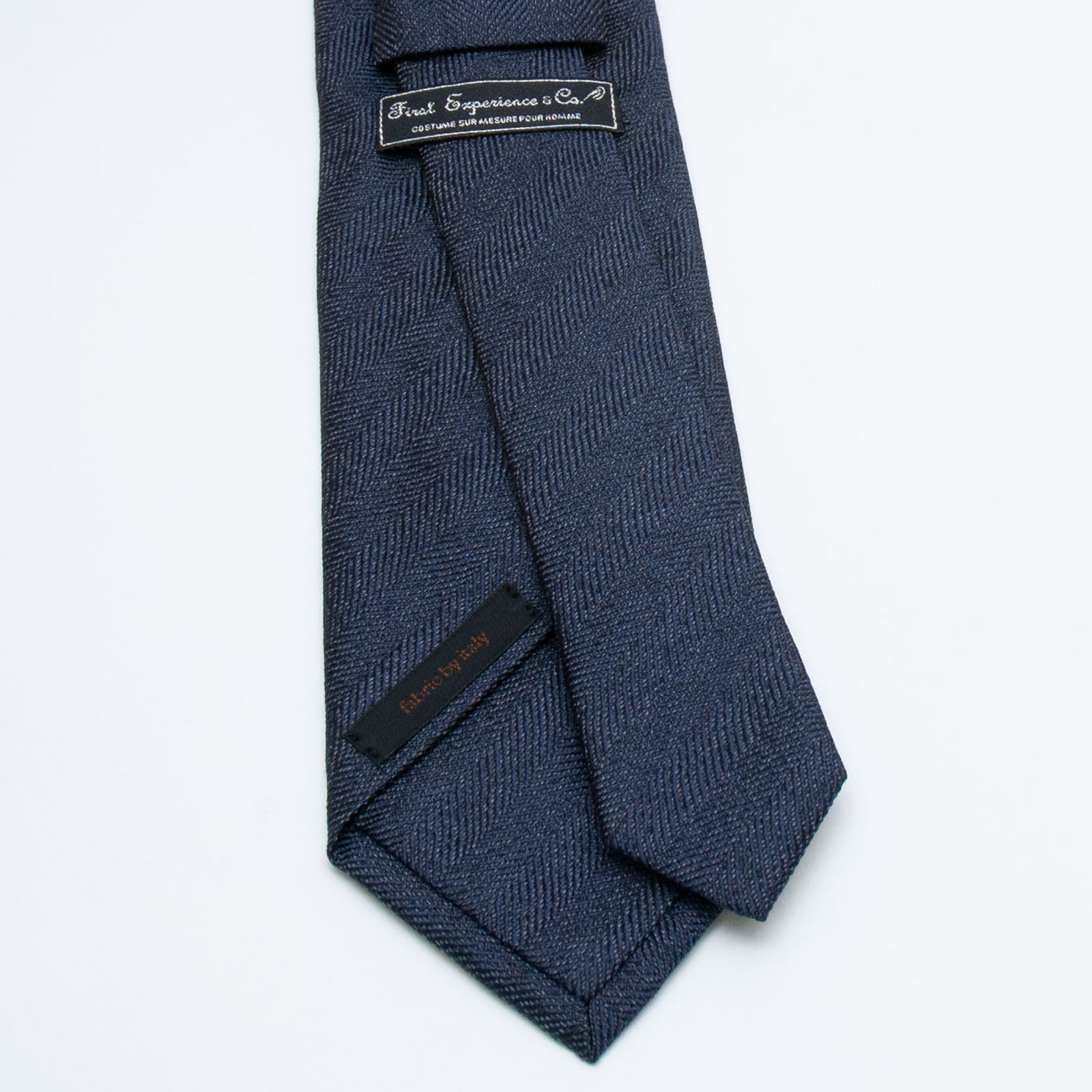 イタリアの素材を使い京丹後の新進気鋭の職人が1本1本手縫いで仕上げたきれいなネイビーのヘリンボーン柄のタイです。
