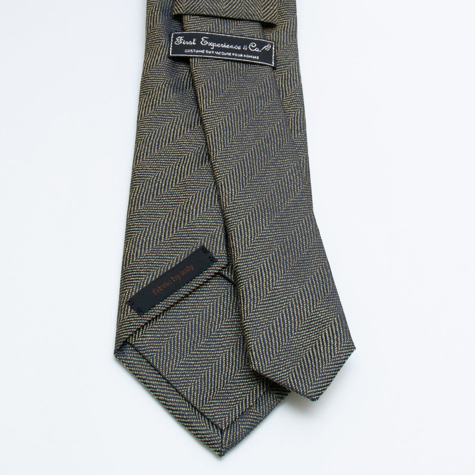 イタリアの素材を使い京丹後の新進気鋭の職人が1本1本手縫いで仕上げたきれいなグリーンのヘリンボーン柄のタイです。