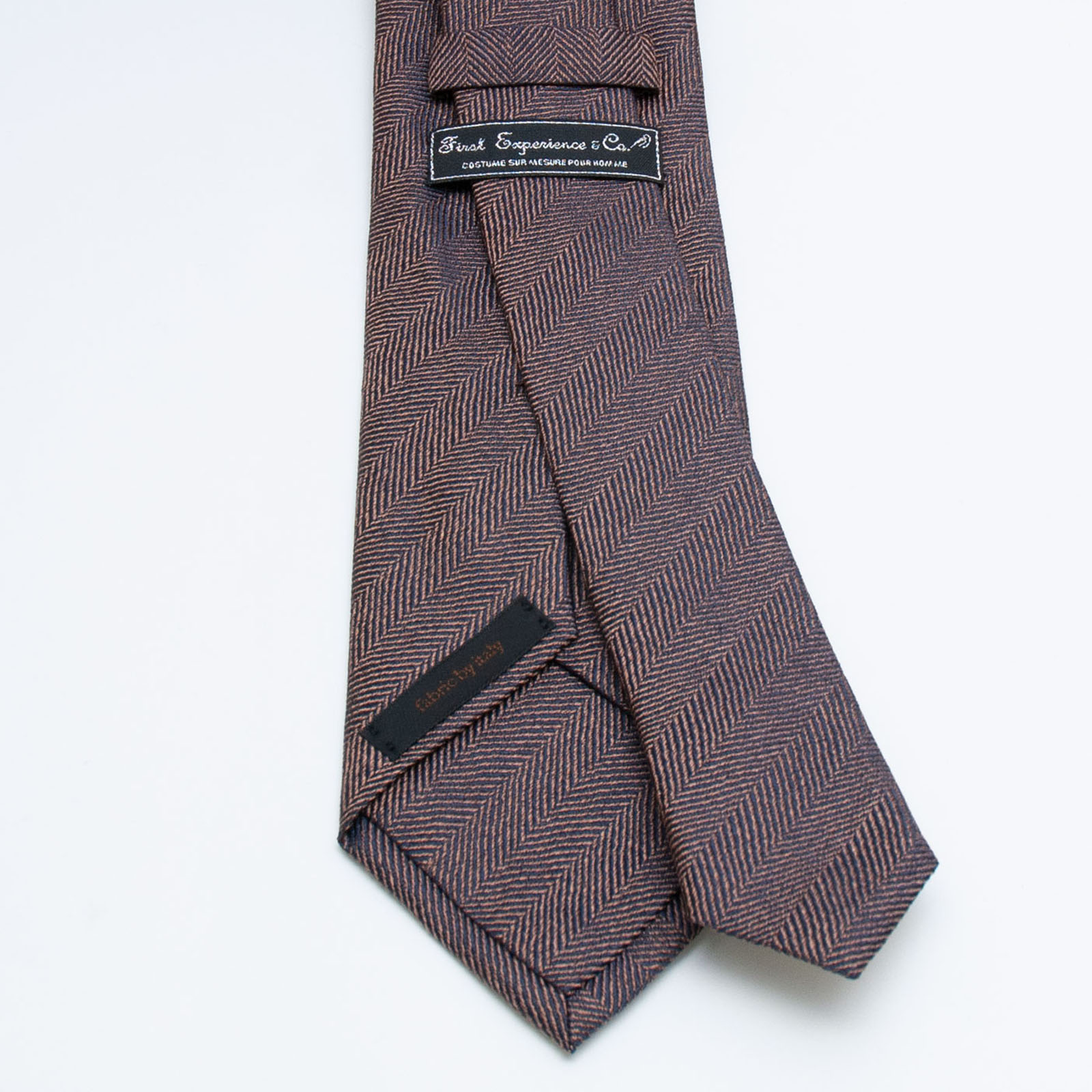 イタリアの素材を使い京丹後の新進気鋭の職人が1本1本手縫いで仕上げたきれいなブラウンのヘリンボーン柄のタイです。