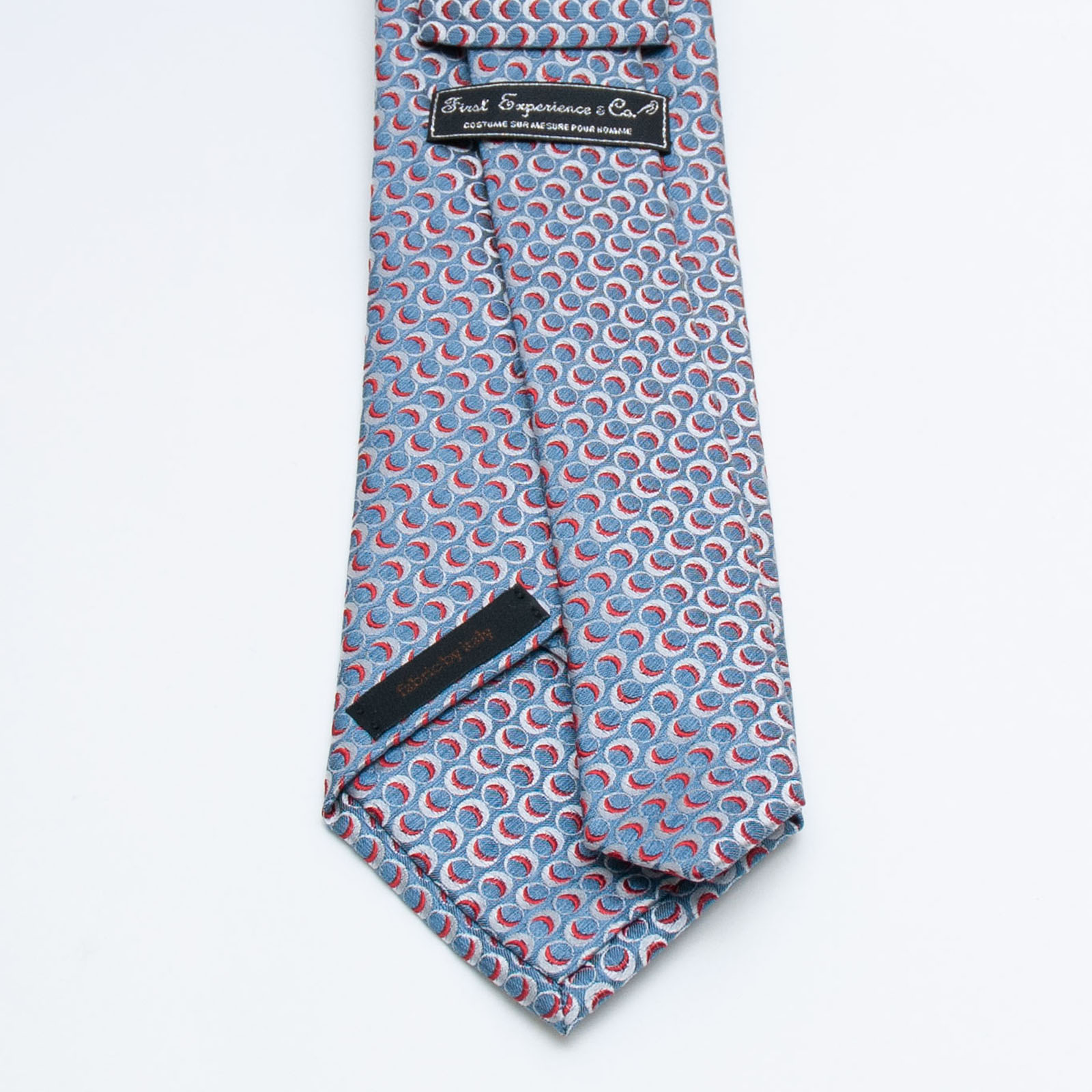 イタリアの素材を使い京丹後の新進気鋭の職人が1本1本手縫いで仕上げた光沢感のあるサックスにシルバーとレッドのボール状三日月柄のタイです。