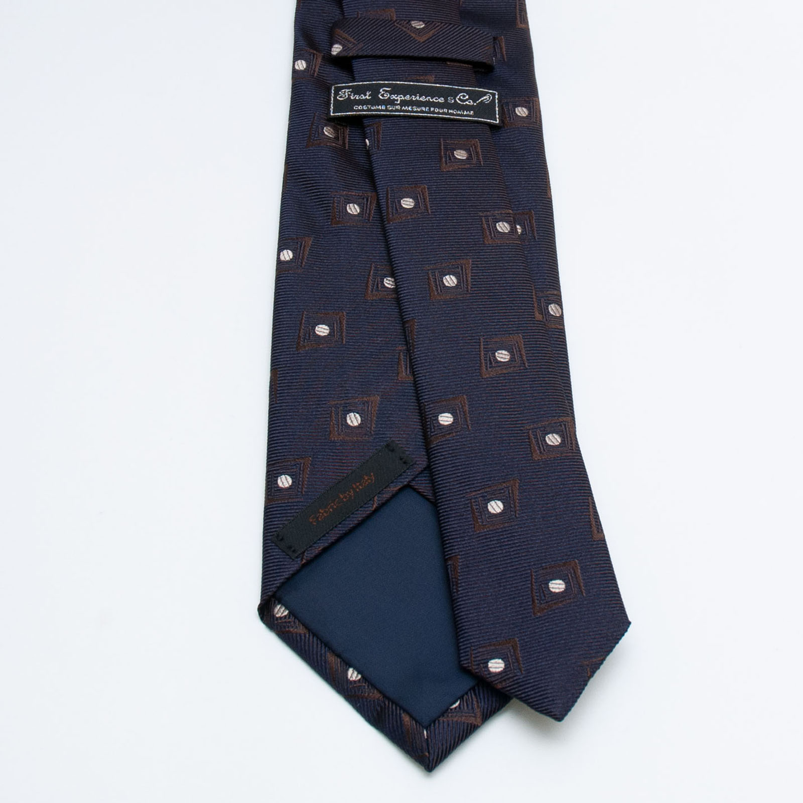イタリアの素材を使い京丹後の新進気鋭の職人が1本1本手縫いで仕上げたきれいなネイビーにスクエア柄とドット柄のタイです。