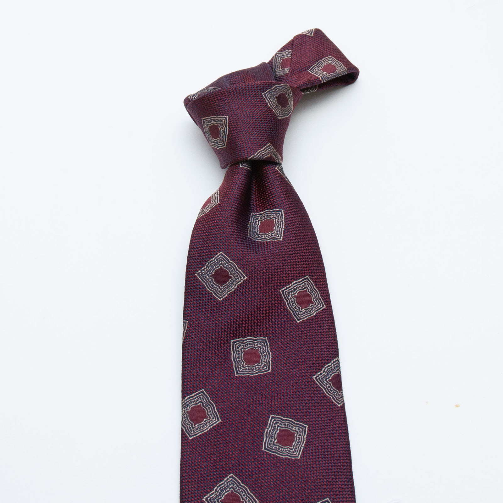 イタリアの素材を使い京丹後の新進気鋭の職人が1本1本手縫いで仕上げたきれいなレッドにアイボリー・スクエア柄のタイです。