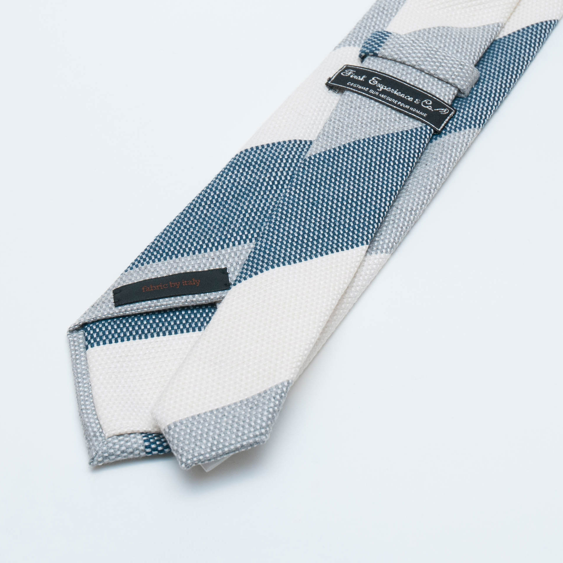 イタリアの素材を使い京丹後の新進気鋭の職人が1本1本手縫いで仕上げたコットン×シルクの春夏向きのネイビー×グレー×オフホワイトのレジメンタル・タイです。