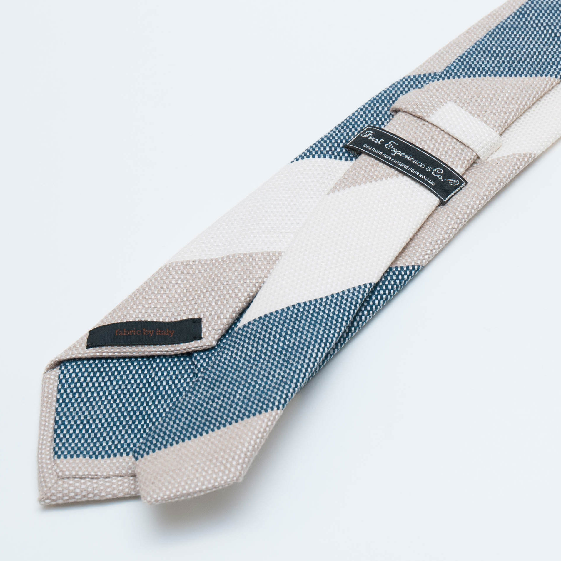 イタリアの素材を使い京丹後の新進気鋭の職人が1本1本手縫いで仕上げたコットン×シルクの春夏向きのネイビー×ベージュ×オフホワイトのレジメンタル・タイです。