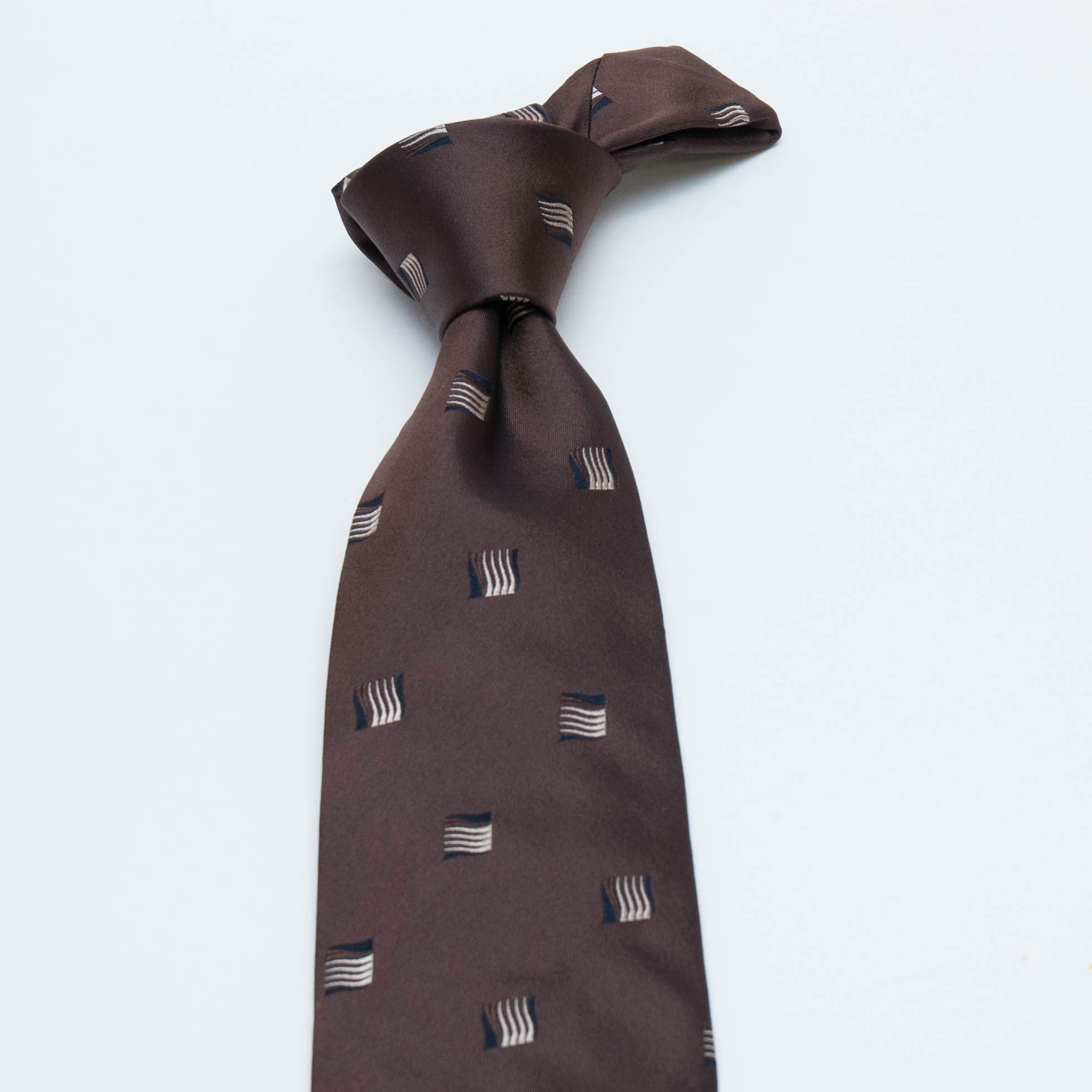 イタリアの素材を使い京丹後の新進気鋭の職人が1本1本手縫いで仕上げた光沢感のあるブラウンに波目模様の柄のタイです。